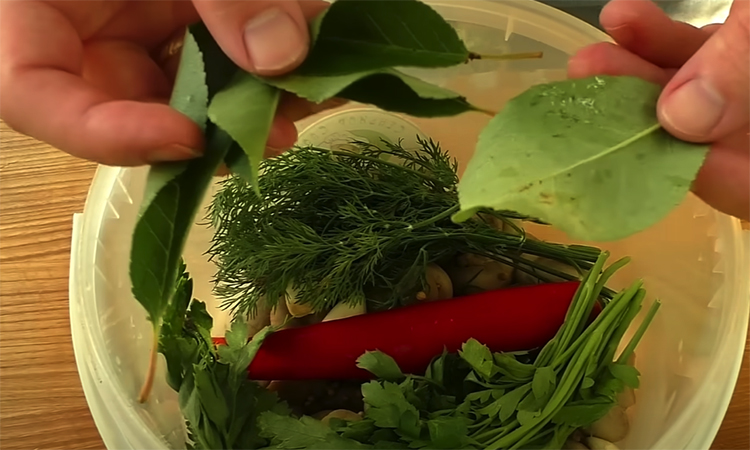 Pievagrybius nuplaukite, palikite nenuluptus. Grybus sudėkite į verdantį vandenį, virkite 5 minutes, tada sudėkite į tinkamą indą. Į grybus suberkite prieskonius, česnaką, aitriąją papriką, žalumynus, krienų lapus ir vyšnias. Vandenyje ištirpinkite druską, užpilkite grybus taip, kad jie būtų visiškai apsemti skysčio, panardinimui naudokite svarelį.