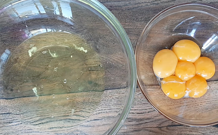 2. Įmuškite 6 kiaušinius ir atsargiai atskirkite trynius į vieną dubenį, o baltymus – į kitą.