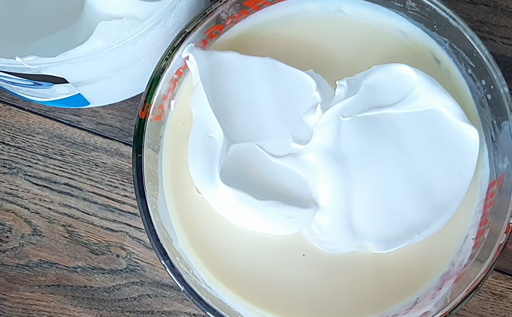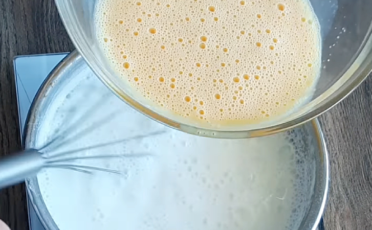 7. Dideliame dubenyje atsargiai sumaišykite pieno (kremo) ir baltymų mišinius. Baltymus supilkite keliais etapais, atsargiai maišydami mentele iš apačios į viršų, kad išliktų purūs. Sumaišytą masę plakite mikseriu vidutiniu greičiu 1–2 minutes, kol mišinys taps vientisas ir purus.
